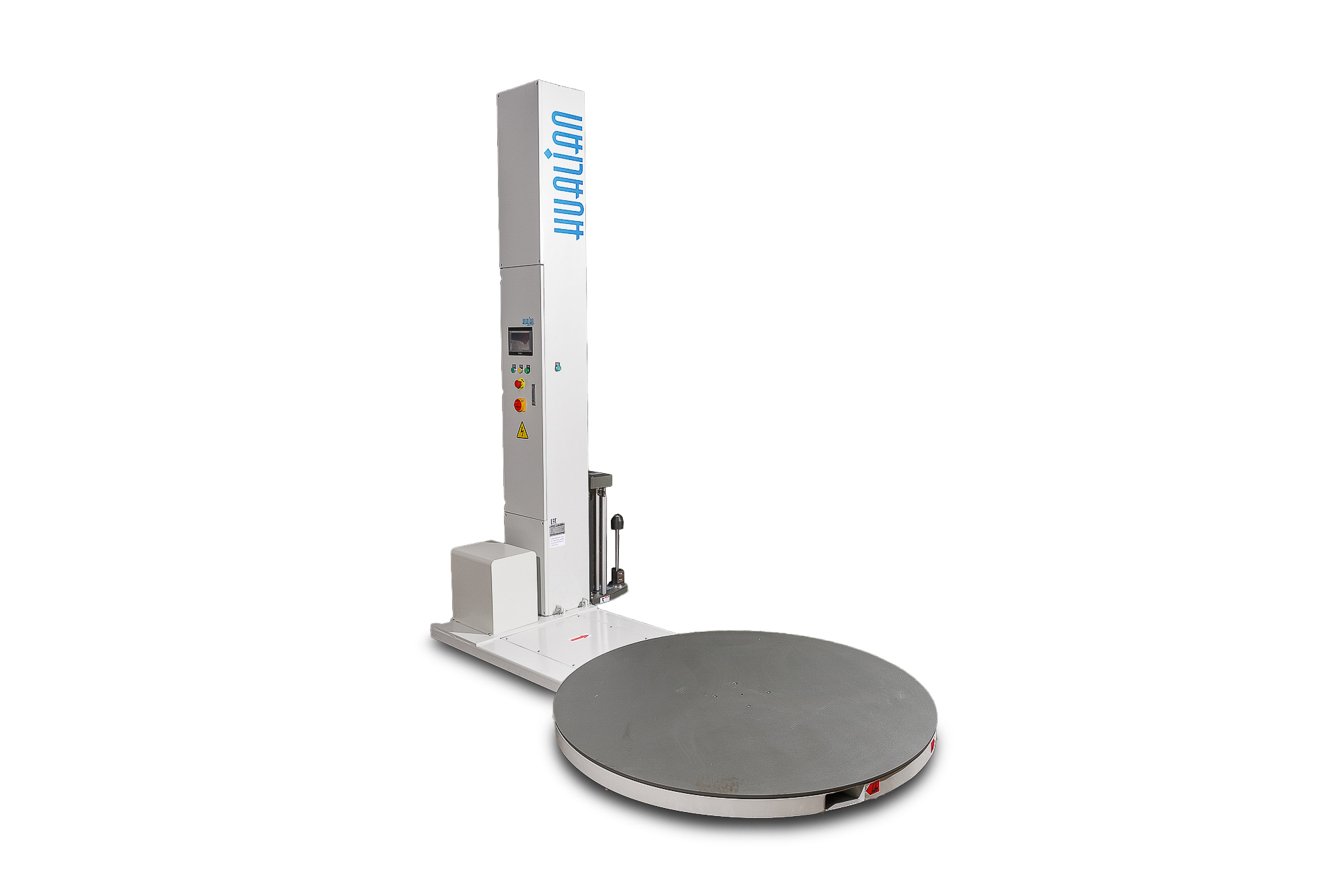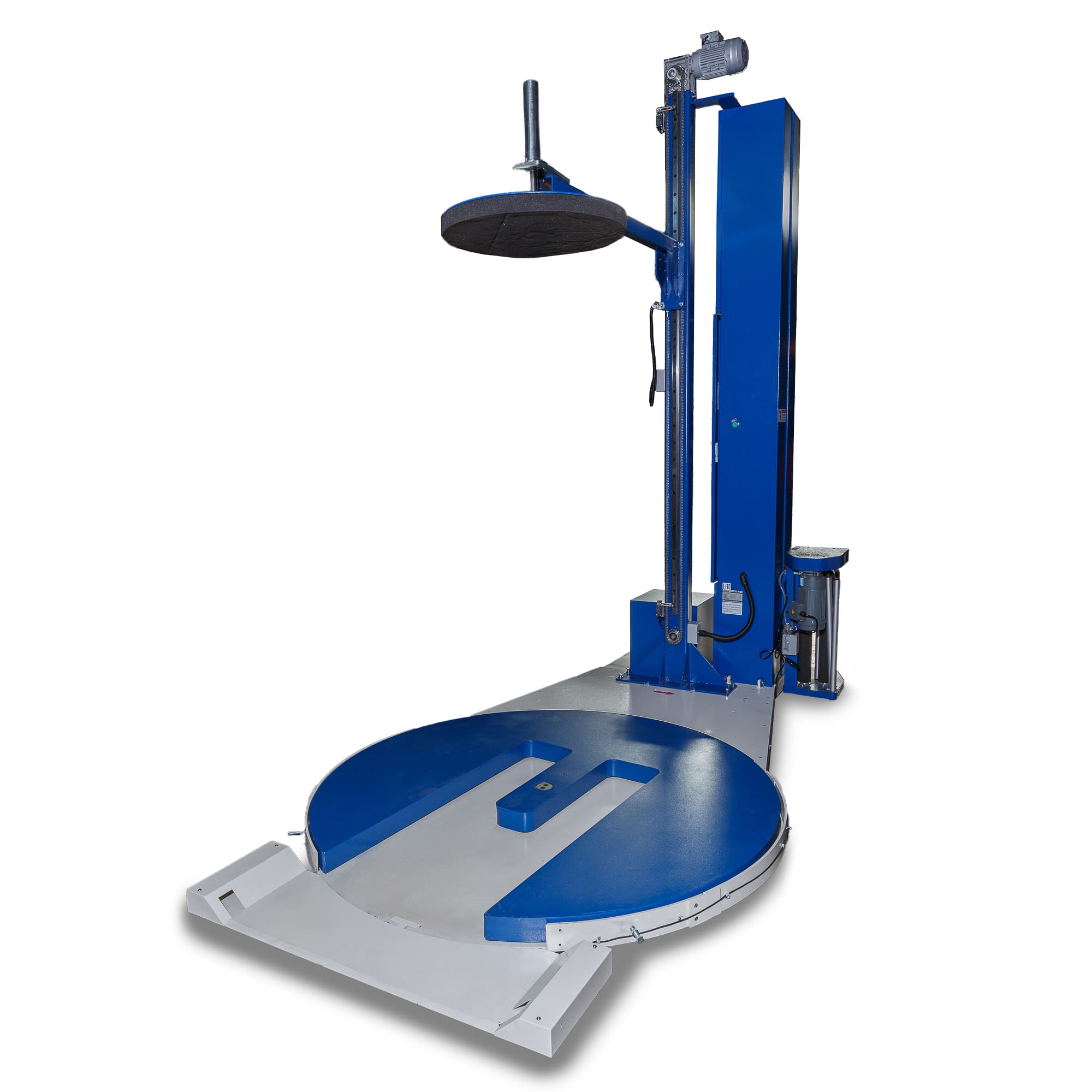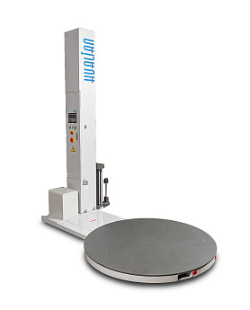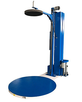 Стационарные вращающимся столом: Груз стоит на вращающейся платформе, а каретка с рулоном пленки движется вверх-вниз. Самый распространенный тип для полу- и автоматических машин.