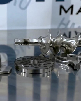 Корпус и все контактирующие с пищевыми продуктами элементы выполнены из качественной пищевой нержавеющей стали. Размер кусочков определяется установленной решеткой ножевого блока. Покупатель может заказать любое количество сменных блоков под необходимые ему размеры нарезки.