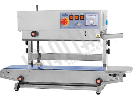 Роликовый (конвейерный) запайщик – это крупное промышленное оборудование, которое в автоматическом режиме выполняет как упаковку, так и постановку даты, нанесение этикетки и пр. Бывает вертикальным (чтобы жидкое или сыпучее содержимое не высыпалось/пролилось) и горизонтальным (упаковывает товары плашмя). Аппараты работают с крупными и тяжелыми грузами с максимальной нагрузкой на конвейер до 10 кг.
