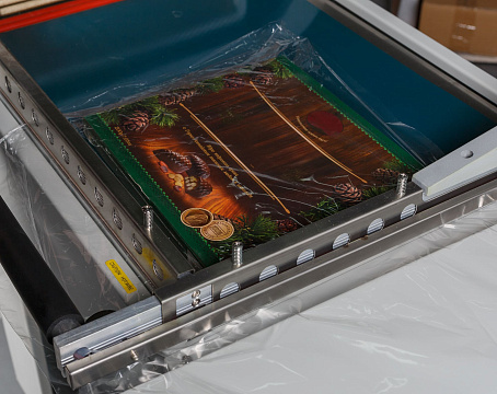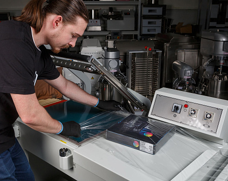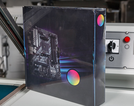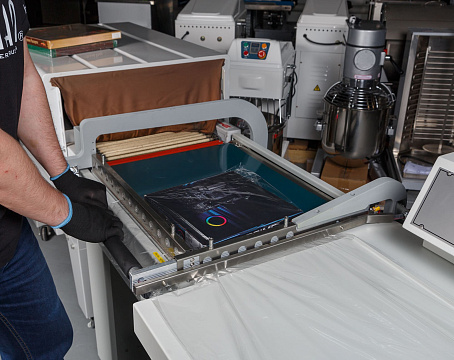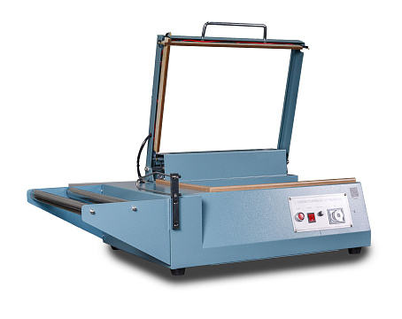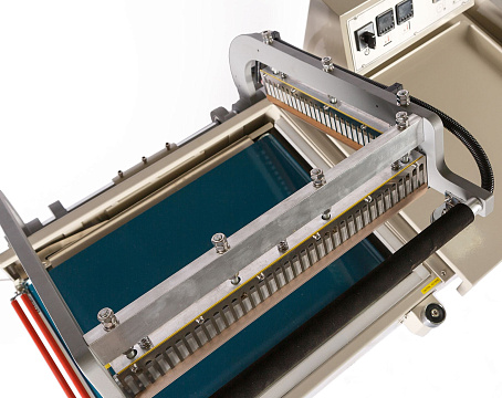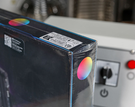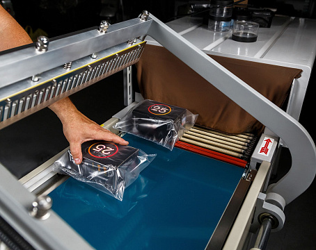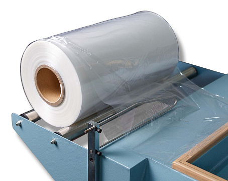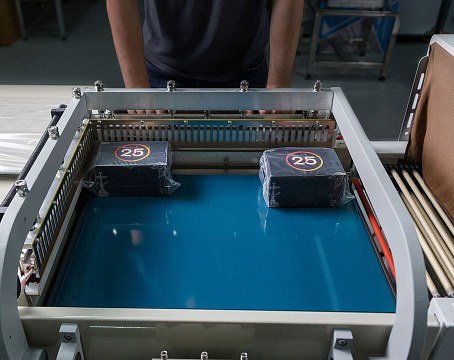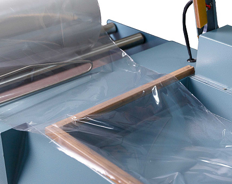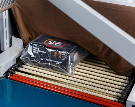 - Формирование пакета: Оператор отматывает нужный отрезок пленки, формирует полурукав, натягивает его на товар и отрезает, прижимая пленку к ножу.