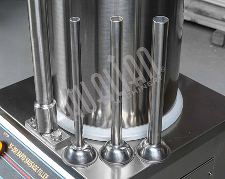 - Компактность и эргономика: Благодаря вертикальной конструкции шприц SF-260 не требует много места в цеху. Загрузка сырья и процесс набивки максимально упрощены для оператора — сила гравитации помогает перемещению фарша, что снижает трудозатраты.