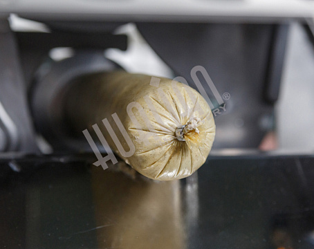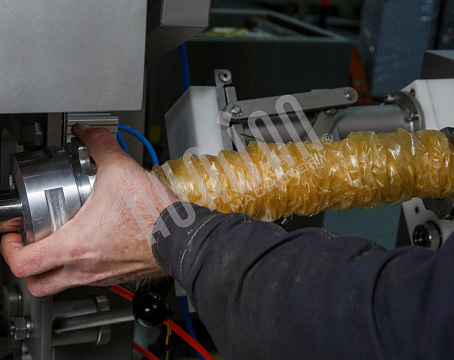 Данную модель колбасного клипсатора мы запустили вместе с клиентом. Использовалась оболочка самого маленького диаметра (40 мм). В нее загружалось сырье для сырокопченого полуфабриката. Для дальнейшей отправки в термоагрегат необходимо было наложение петли. Аппарат отработал на отлично. Клипса села плотно, содержимое оболочки через нее не просочилось. Клиент остался доволен демонстрационным запуском и приобрел машину в свой цех.