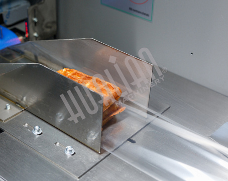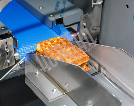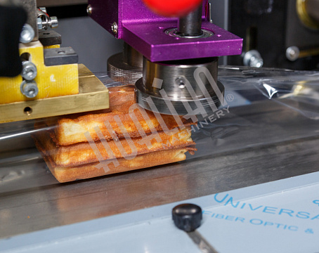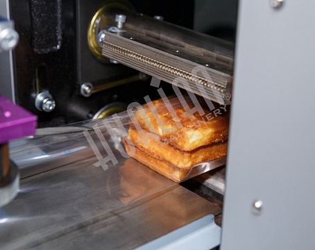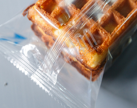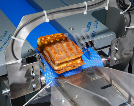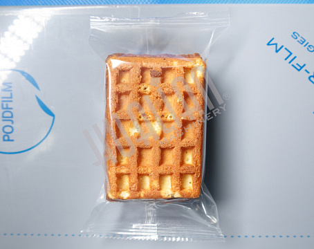 Первый тестовый запуск проводился на объемных мягких вафлях (в пакет помещалось 2 штуки). Он прошел успешно – пакет получился аккуратным и герметичным, швы – ровными. В такой упаковке вафли намного проще транспортировать, т.к. они защищены от внешних воздействий, а значит, точно сохранят товарный вид.