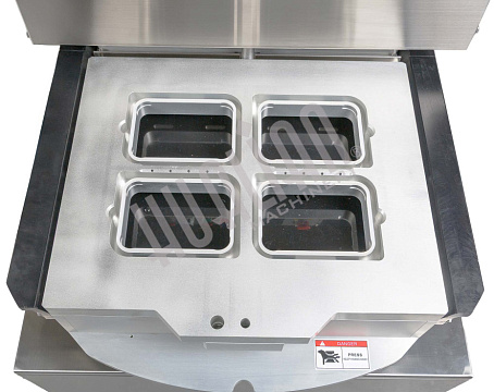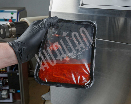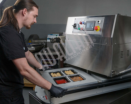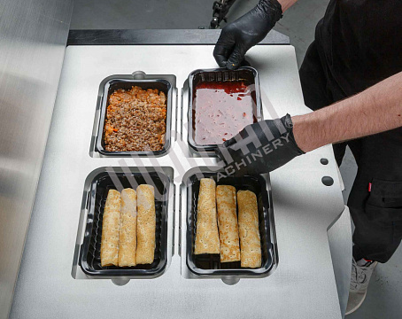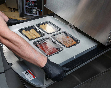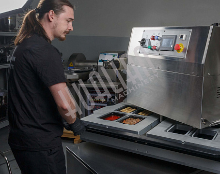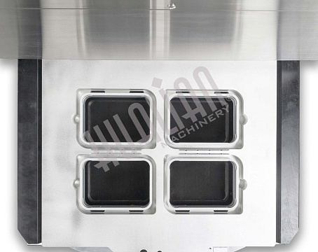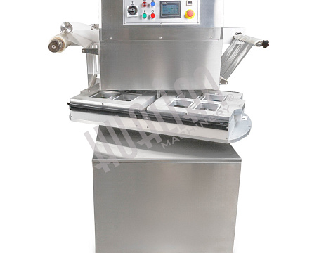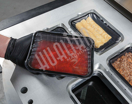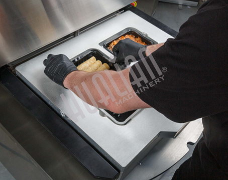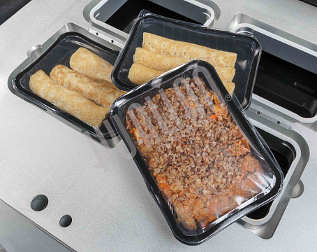 Ключевое преимущество HVT-450R — возможность параллельной работы оператора и машины. Пока одна зона выполняет запайку, вторая может загружаться новыми лотками, что минимизирует простой и ускоряет процесс. Это особенно важно для пищевой промышленности, где нужны скорость и высокая производительность.
