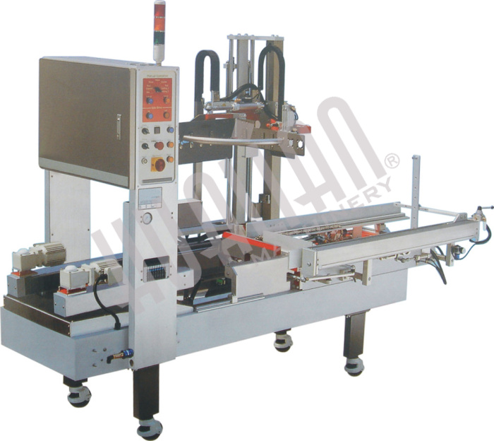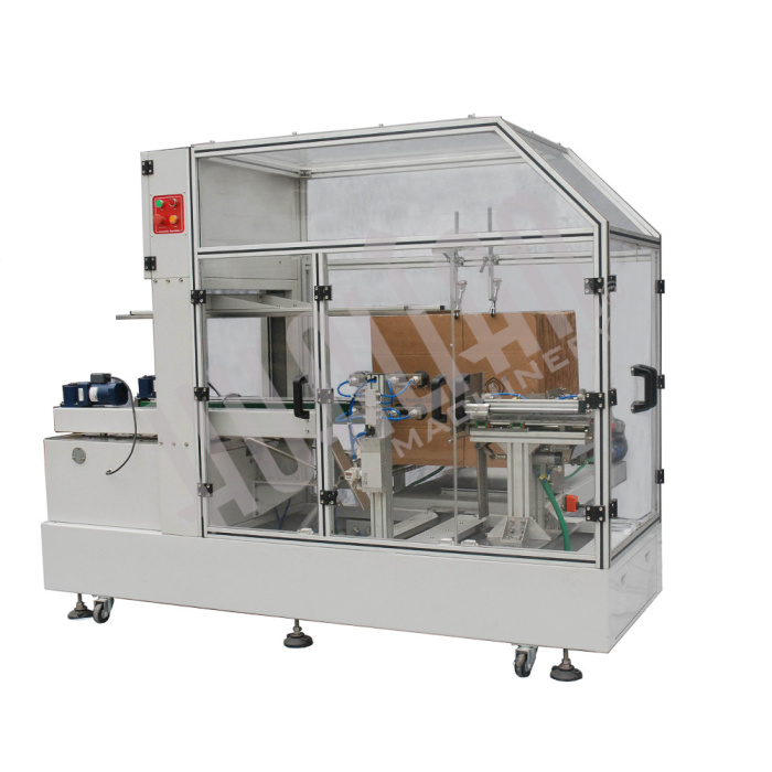 Он может собирать коробки, складывать нижние клапаны и заклеивать упаковку. Работает с несколькими видами скотча – БОПП, ПВХ, безводная клейкая лента. Обладает высокой скоростью сборки – до 8-10 штук в минуту.