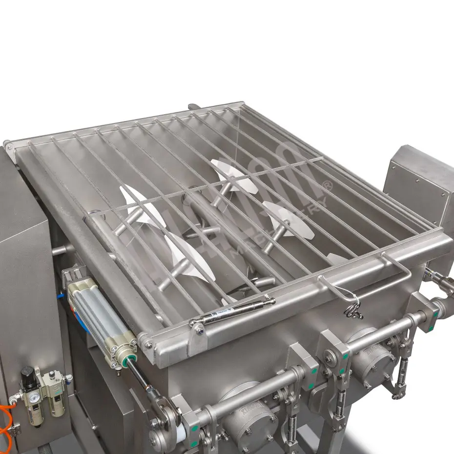 JB-300 – еще одна модель серии промышленных фаршемесов открытого типа с месильным органом в форме лопастного шнека. Данная модель оснащена двумя шнеками, автономно управляемыми при помощи двух мотор-редукторов. Емкость дежи – 300 л, разовая загрузка сырья – 210-260 кг.