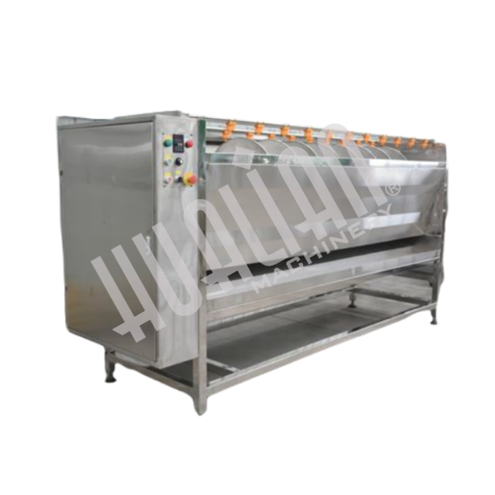 Машина оснащена фильтрующей пластиной для снятия кожуры и винтовым пропеллером для выдачи обработанных корнеплодов.
