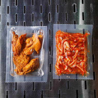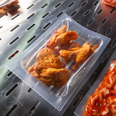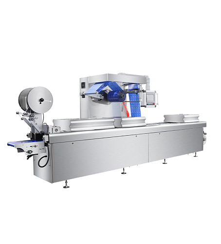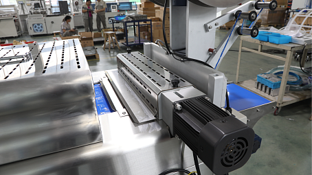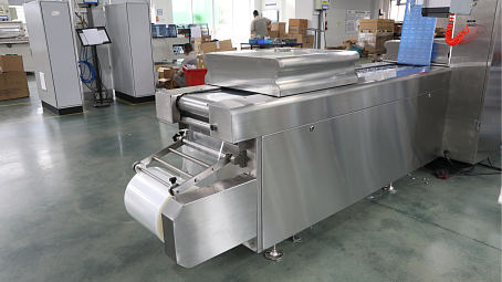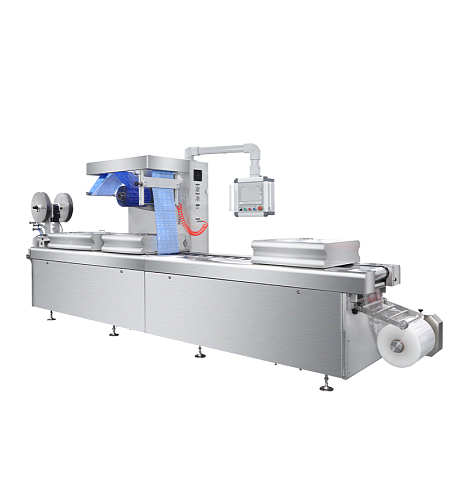Здесь задача оператора укладывать продукцию вручную для дальнейшего вакуумирования и запайки лотка. Длина зоны закладки продукта может быть увеличена при необходимости, что позволит увеличить производственную площадь оборудования.
