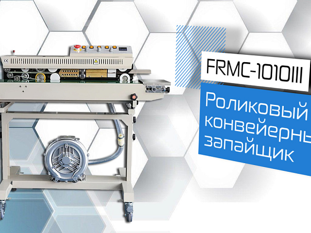 FRMC-1010III – модель горизонтального напольного запайщика из серии роликовых конвейерных запайщиков с расширенной и удлиненной базой конвейера. Для напольной установки запайщик оснащен подставкой с подвижными колесами. Особенностью данной модели является наличии функции откачки воздуха. Она используется для уменьшения объема пакета и продления срока годности упаковываемого продукта.