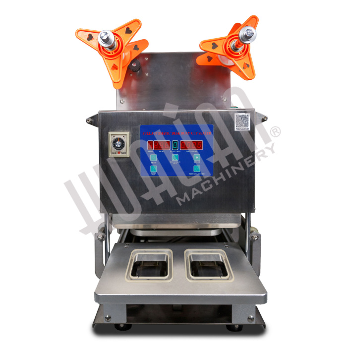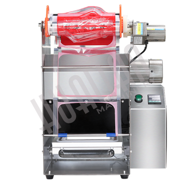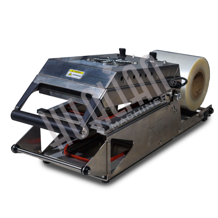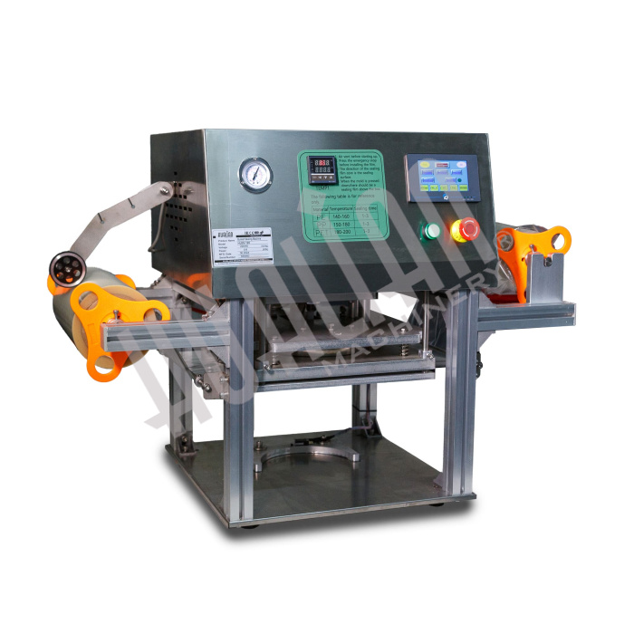 Полуавтоматические машины. Лоток устанавливается оператором, но упаковка контейнера выполняется автоматически. Запайщики лотков полуавтомат имеют большую популярность, так как подходят для небольших и средних производственных объектов.