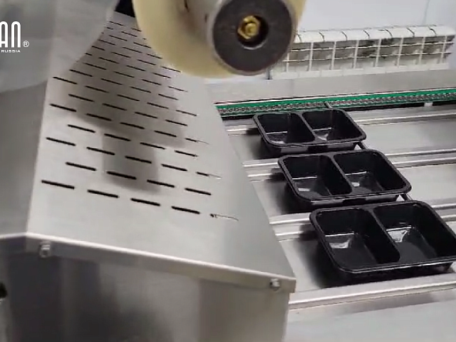 Для упаковки может использоваться как прозрачная, так и цветная пленка с рисунком – запайщик позиционирует пленку как по фотометке, так и по заданной длине. Максимальная ширина пленки в данной модели – 550 мм. В продаже также имеется модель с шириной пленки 450 мм (HVT-450M). Каждый типоразмер запайщика представлен в вариантах на 2, 4 лотка и даже больше лотков – в зависимости от размера лотка и соотношения его относительно размеров упаковочной базы.