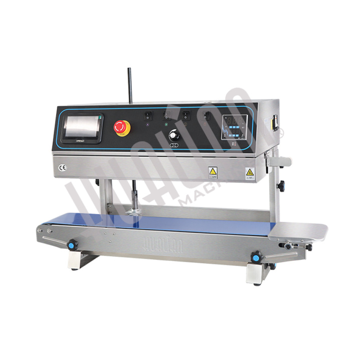 FRM-1010II – модель вертикальной запайки из серии роликовых конвейерных запайщиков с удлиненным широким приводным конвейером.