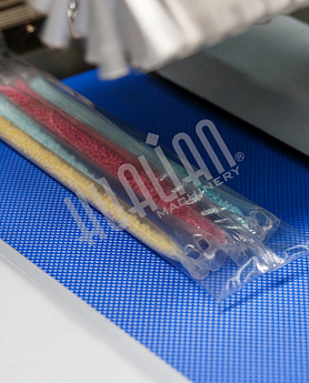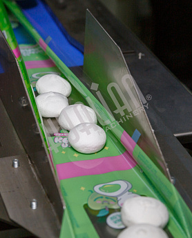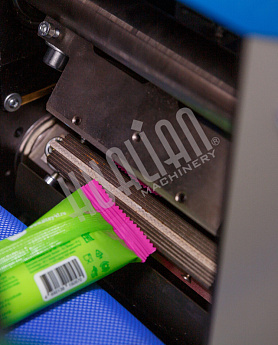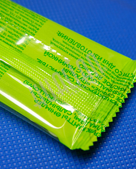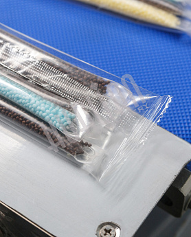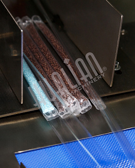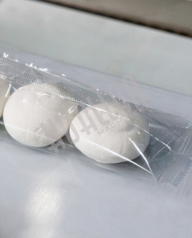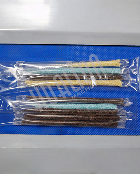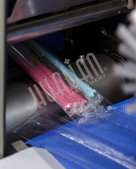 Еще одно преимущество машин данной серии – универсальность. Их можно использовать для упаковки самого широкого ассортимента продукции. В нашем примере машина легко перенастроилась с упаковки зефира на узкие пакетики с кондитерскими посыпками. Такая перенастройка возможна благодаря наличию в комплектации регулируемого формирователя пакета. Машина упаковывает продукцию в популярный трехшовный пакет «подушку» (флоу-пак).