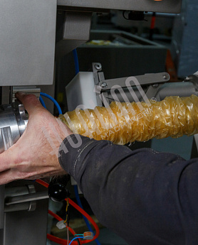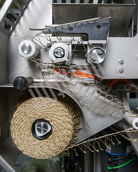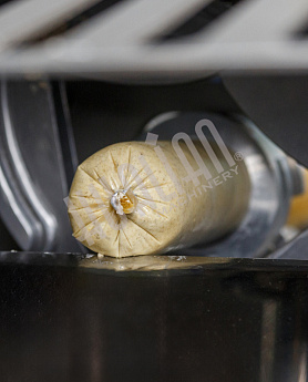 Данный аппарат является автоматическим и двухскрепочным. Обычно он “встраивается” в цепочку оборудования после вакуумных шприцов, которые наполняют оболочку будущим продуктом. Машина также умеет накладывать петли. Они нужны при дальнейшем помещении изделия в термодымовую камеру.