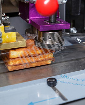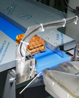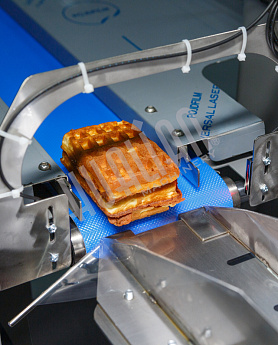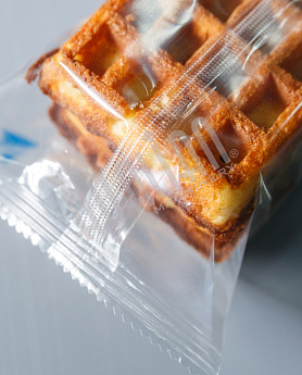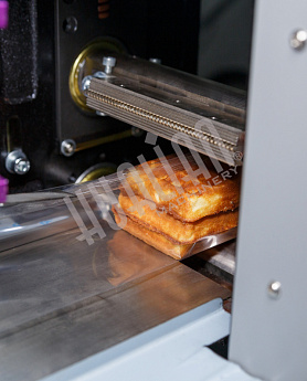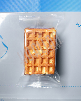 Первый тестовый запуск проводился на объемных мягких вафлях (в пакет помещалось 2 штуки). Он прошел успешно – пакет получился аккуратным и герметичным, швы – ровными. В такой упаковке вафли намного проще транспортировать, т.к. они защищены от внешних воздействий, а значит, точно сохранят товарный вид.