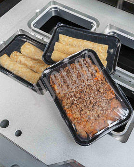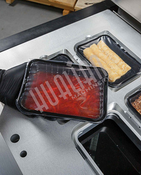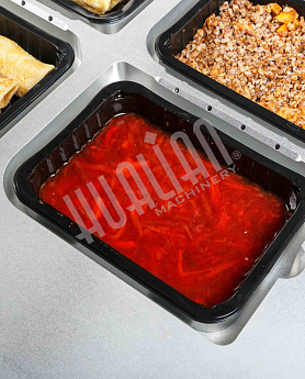 В ходе тестирования проверялась работа запайщика на готовых продуктах: гречке, супах, блинах и котлетах. Оборудование показало стабильную работу, обеспечивая герметичность и аккуратность упаковки.
