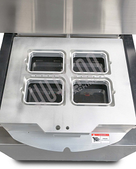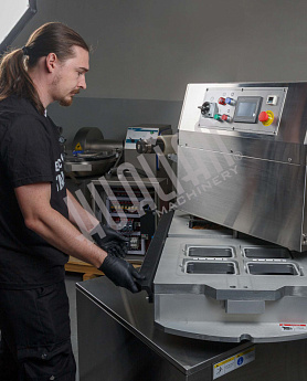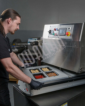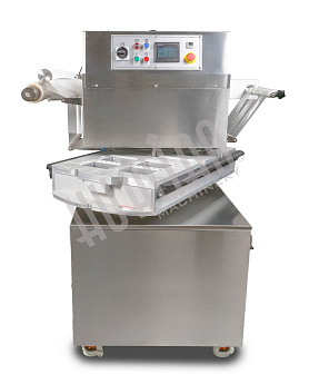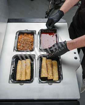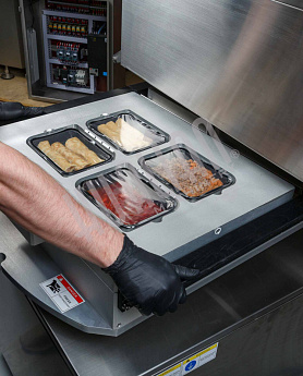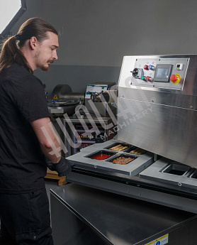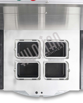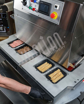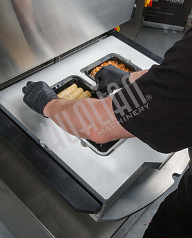 Ключевое преимущество HVT-450R — возможность параллельной работы оператора и машины. Пока одна зона выполняет запайку, вторая может загружаться новыми лотками, что минимизирует простой и ускоряет процесс. Это особенно важно для пищевой промышленности, где нужны скорость и высокая производительность.