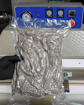 - Надежную запайку пакета. Запаечная планка имеет пневматический привод, поэтому шов получается прочным. Дополнительно на оборудование для вакуумной упаковки можно установить все необходимое для запайки двойным швом (такая комплектация будет стоить дороже).