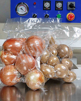 Далее мы продолжили эксперимент, но уже с пищевой продукцией – луком и картофелем. Оборудование также быстро справилось с откачкой воздуха и запайкой. Овощи в пакете плотно прилегают друг другу, подвинуть их внутри пакета не удастся. Вакуумный упаковщик имеет особенный плюс для продуктов питания – в безвоздушном пространстве их срок годности гораздо больше, чем в обычном пакете. Также плотная упаковка не позволяет проникнуть влаге, поэтому овощи или фрукты не начнут гнить. Если коротко, тестированием мы остались довольны, как и произведенной оборудованием упаковкой.
